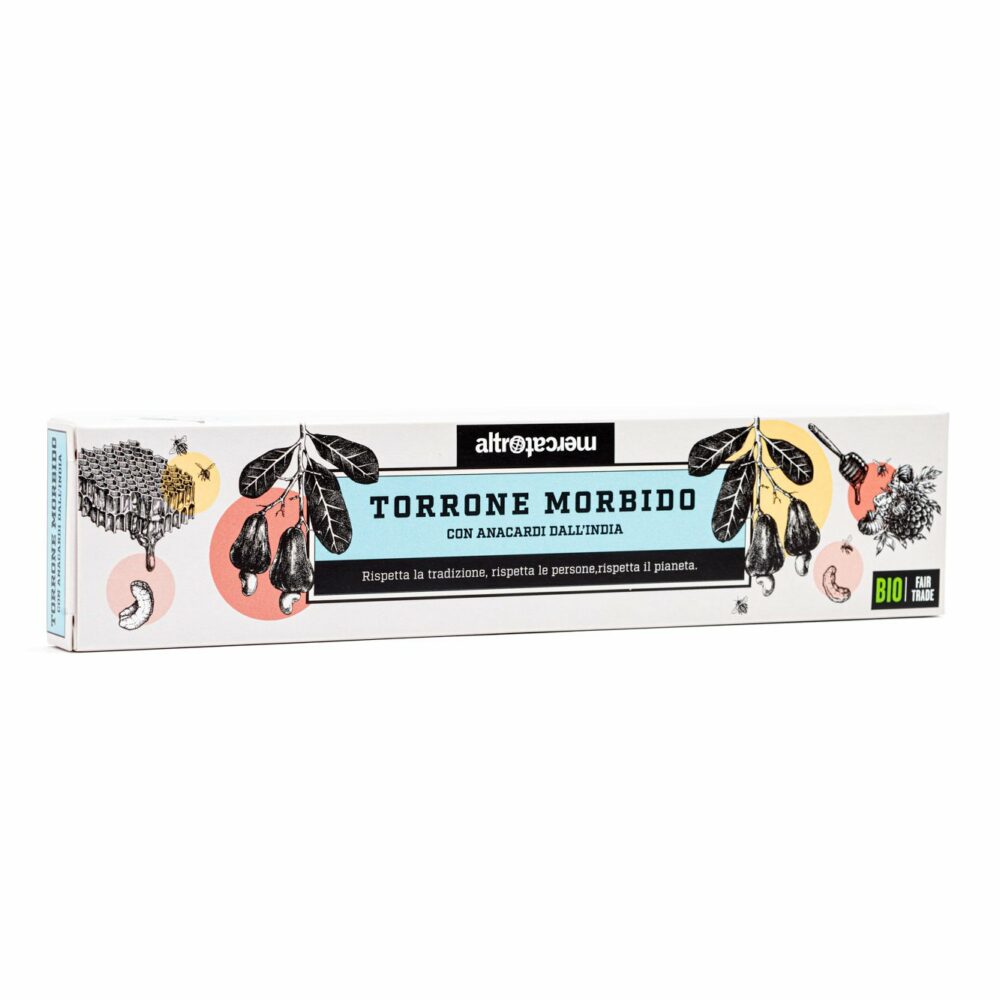 Stecca di torrone morbido con anacardi da 90g, prodotto a partire da materie prime del Commercio Equo e Solidale, confezionato in flow pack trasparente food grade ed in astuccio in cartoncino stampato.